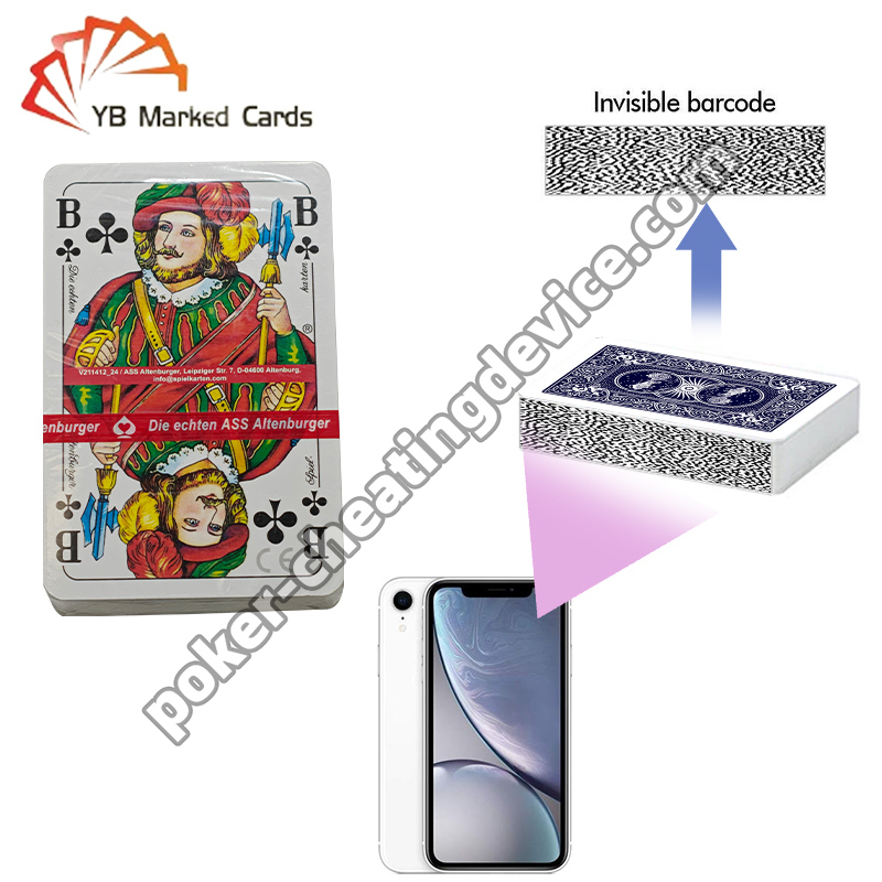 Contrairement aux cartes à marquage infrarouge dépassées, les cartes ASS Altenburger comportent des codes à barres discrets imprimés sur les quatre bords à l'aide d'une encre invisible spécialisée.Ces marques sont complètement indétectables, même avec des lunettes infrarouges ou des lentilles, garantissant une sécurité et une furtivité de 100% pendant le jeu..